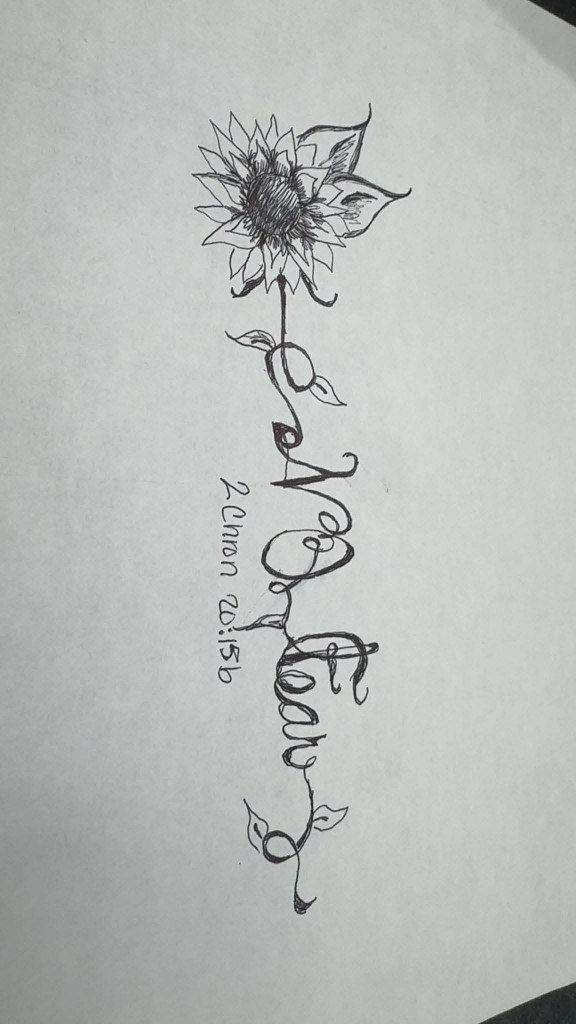 I have designed a tattoo that I plan to get. I’m not the type of person that just put things on her body without reason. Not saying it’s wrong, it’s just not me. I have two and both point to my faith in Christ, but this one….it represents me flourishing into a new creation, into the person i was always called to be, and showing that keeping my face towards the Son is how you grow and survive. 2Chronicle 20:15b has become my verse that will be incorporated in it because it has become my life line. It says “Do not fear or be dismayed because of this great multitude, for the battle is not yours but God’s.” How great is that promise…do not fear or be dismayed because the battle is not mine it is God’s! And for me……..as broken as I feel….I know God has been building me back and putting me back together and making me more into His image…..and thats what this represents for me. I’m not perfect……..and to be honest…..I’m far from ok…..but at the same time I am ok…..if that makes sense. I’m ok because I know God s fighting this battle for me……I am ok because I have the most amazing parents…..I am ok because God has placed a couple of unlikely people in my life that will listen but also lay it out straight to me.